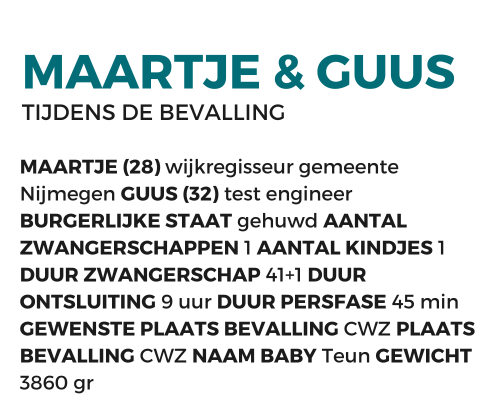 Het infuus ging eruit en het hartfilmpje van de baby werd losgekoppeld. In mijn hoofd was dit even schakelen. Het ene moment dacht ik dat het nog een paar uur zou duren en het volgende moment mocht ik gaan persen. Gelukkig waren voor mij de persweeën een stuk beter te doen. Ik kon op adem komen tussendoor en na driekwartier persen hoorde ik van Sien dat het hoofdje geboren was. Dit werd mij ook snel duidelijk, want onze kleine ging al huilen voordat de rest van zijn lijfje geboren was. Zowel Sien als de verpleegkundige uit het ziekenhuis hadden dit nog niet meegemaakt. Het horen van dit gehuil maakte een bepaalde oerkracht in mij los. Ik wilde per se dat in de volgende wee ons kindje geboren zou worden. En dat gebeurde ook. Bij de volgende wee werd onze zoon Teun geboren. Guus heeft Teun samen met Sien aangepakt en daarna op mijn borst gelegd. Dit moment vergeet ik nooit meer. Wij wilden het geslacht van te voren niet weten, dus ik keek vol verwachting naar Guus: hebben we een jongen of een meisje gekregen? Het bleek een prachtig kereltje te zijn.